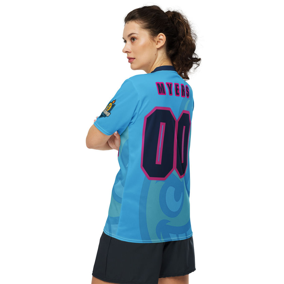 Looking for the perfect sports jersey? We have you covered—made of 100% recycled polyester fabric, this shirt is breathable, moisture-wicking, and has a double-layered v-neck collar that creates a premium look.